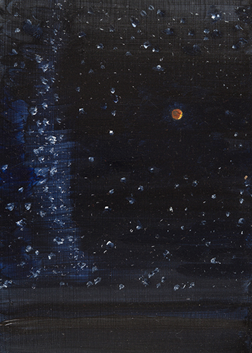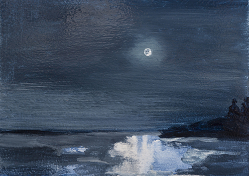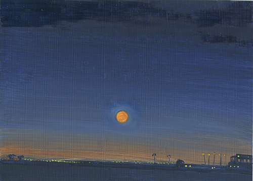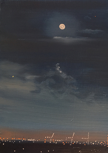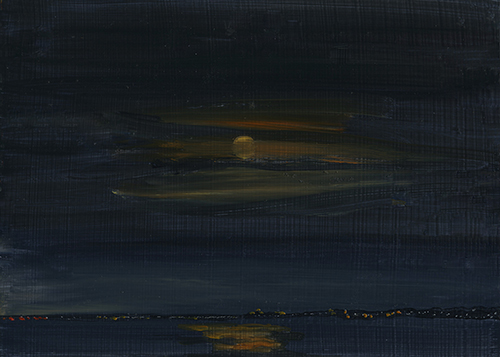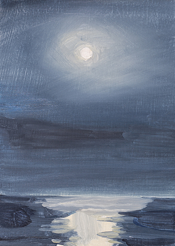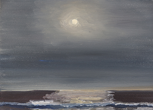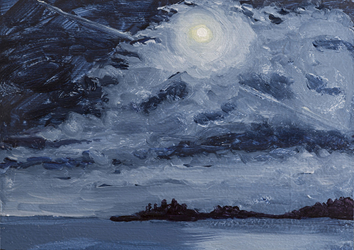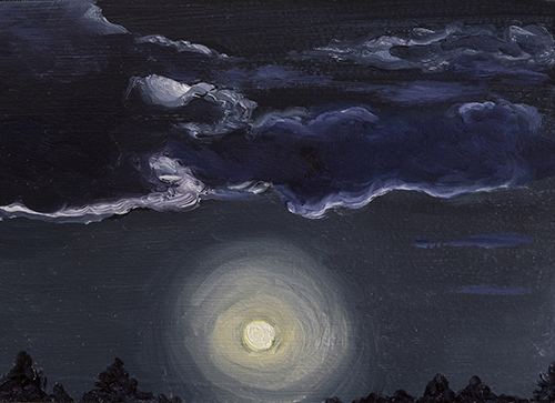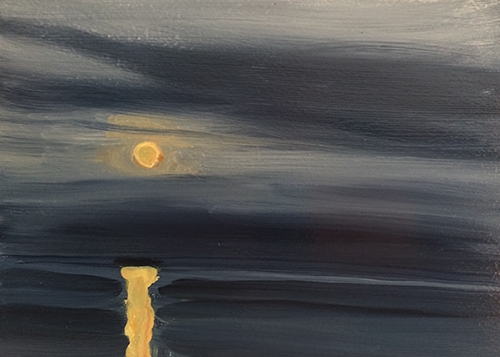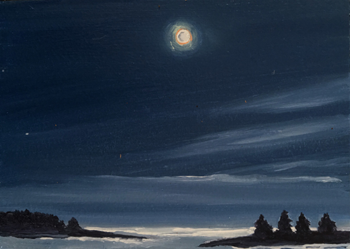 Why the moon: on September 28, 2015, those of us in North America were treated to a full lunar eclipse, which only occurs at a full moon, and if the moon passes through the earth’s umbral shadow, where the earth blocks all direct sunlight reaching the moon. I live near the Atlantic Ocean, where light pollution is mostly non-existent, and the lunar eclipse was a sight to behold at the beach along the Maine coast. The moment the eclipse occurred, the sky became a blue-black dark as the moon became orange, and millions of stars and the Milky Way were visible, more than I have ever seen. This astronomical event inspired me to begin my current obsession with painting the full moon each month.